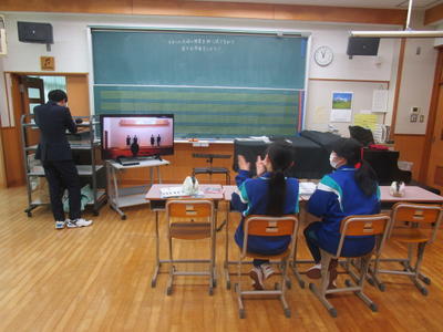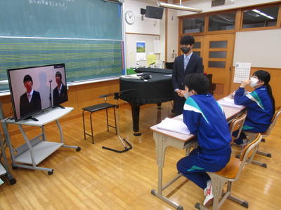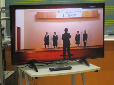 音楽の時間に、ミニ湯中祭の合唱を映像を見て振り返りました。自分のたちの映像を見ることは最初は気恥ずかしそうでしたが、見た後のコメント欄に良い振り返りの言葉をたくさん書いていました。