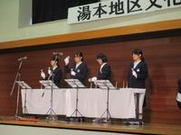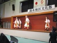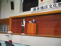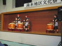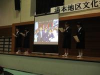 11月3日(日)に幼・小・中学校と湯本地区の合同文化祭が行われました。午前中は、幼・小・中学校の発表が行われました。中学校は、英語弁論、少年の主張、学習発表、ARグルメマップ紹介、合唱、ハンドベル、五倫太鼓、よさこいなどたくさんの発表を全校生徒4名で行いました。どれも素晴らしい発表でした。