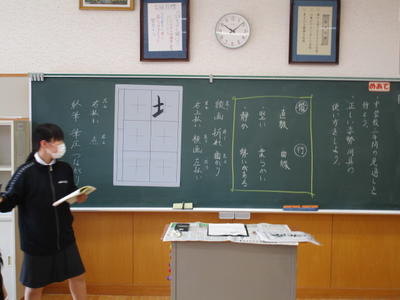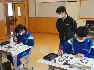 1年生が中学校で初めての書写の授業を行いました。国語の先生の指示にしたがって、書き方のコツを確認しながら「地球」という字を真剣に書いていました。