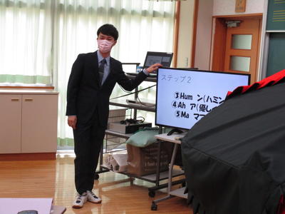 2020年4月21日 09時02分1年生の音楽の授業です。発声方法などを学習しています。先生に工夫した発声を教えてもらって楽しそうです。生徒2人の授業なので、十分に「3密」に気をつけることができます。
