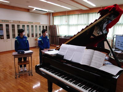 1年生の音楽の授業です。発声方法などを学習しています。先生に工夫した発声を教えてもらって楽しそうです。生徒2人の授業なので、十分に「3密」に気をつけることができます。